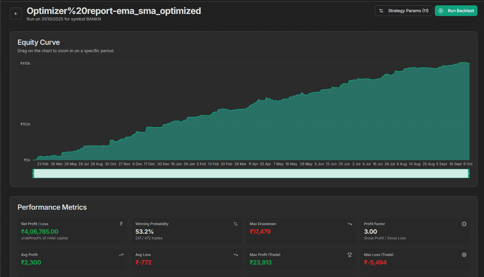 Analyze the optimized strategy and deploy on any algo trading website with confidence.