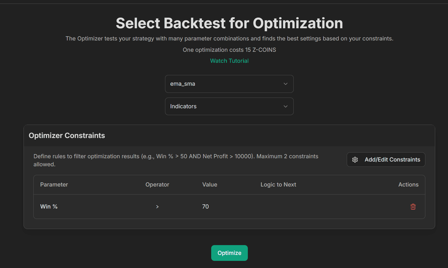Tradzy's AI Optimizer is a tool which finds the best performing set of parameters for your strategy.